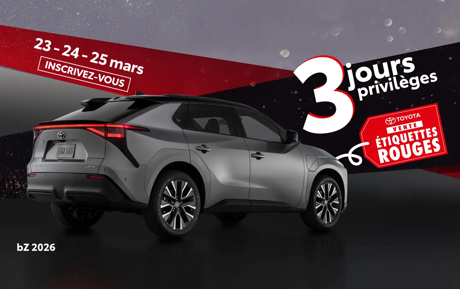 Ne manquez pas cette occasion unique de repartir en Toyota à un prix exceptionnel. Inscrivez-vous dès maintenant en remplissant le formulaire ci-joint. Les places sont limitées, réservez sans délai!